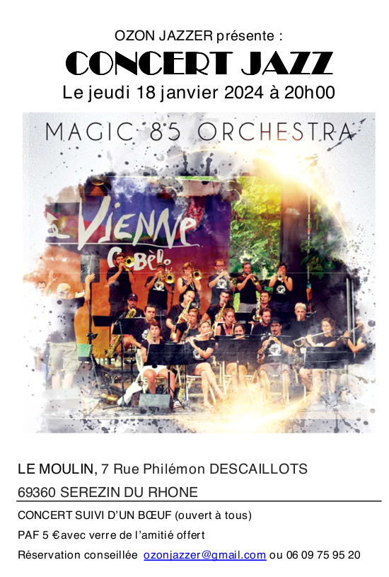 Cette année, dans le cadre du « Big Band Battle », Music85 organise un stage autour de la musique de Big Bands. Vous avez plus de 10 ans, vous pratiquez votre instrument depuis plus de 4 ans,Vous êtes saxophoniste, trompettiste , flûtiste, clarinettiste , tromboniste, guitariste, bassiste, batteur ou clavieriste … et vous êtes fan de jazz. Ce stage est pour vous!!!! Venez célébrer les 100 ans de la musique en Big Band Une répétition par mois (voir calendrier) et un concert dans le cadre du prestigieux « Big Band Battle » (festival des Bigs Bands à Oullins), vous permettra de découvrir la musique au sein de cet ensemble typique de la musique jazz depuis la création des premiers big bands dans les années 20, jusqu’à nos jours (les années 20 aussi). Ce stage est encadré par François Blanc ( professeur de flute, de formation musicale, compositeur et arrangeur) et se déroule dans les locaux de Music85 , école de musique à Oullins. Participation 10€ par journée de stage, Condition pour participer aux stages : être présent à chaque répétition et aux concerts Inscription sur music85oullins@gmail.com