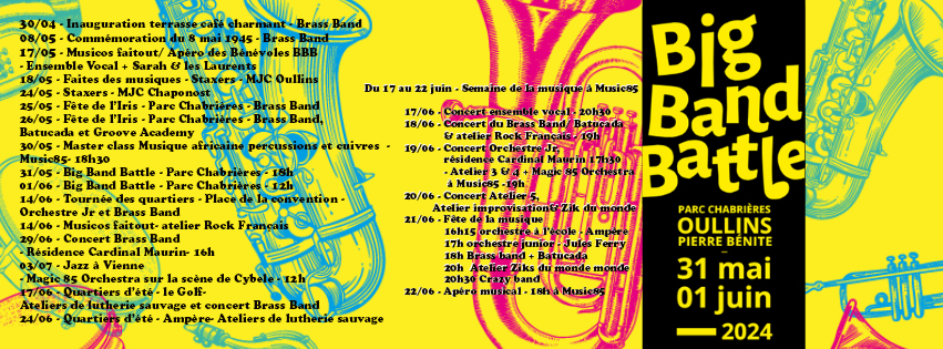 Ce week-end se tiendra la deuxième édition du Big Band Battle Festival organisée par Music 85, association bien connue des Oullinois-Pierre-Bénitains, qui, depuis presque 40 ans, cultive l’art et l’envie de partager la musique avec le plus grand nombre !