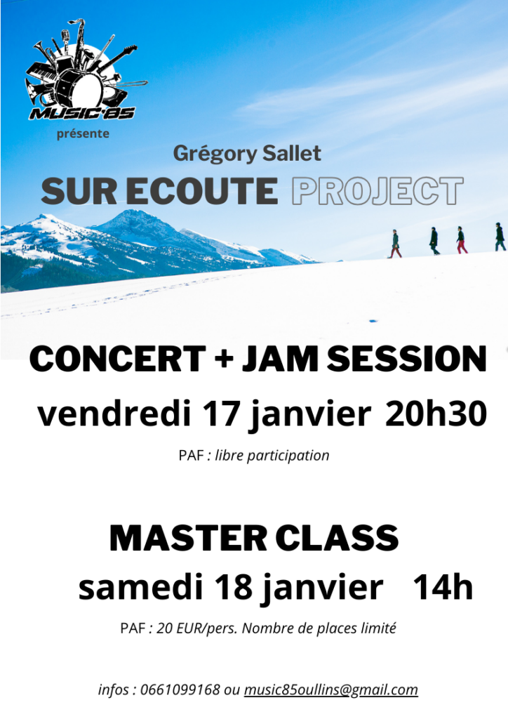 Pour démarrer l’année, ce vendredi 17 janvier, Music85 vous propose de retrouver Greg Sallet, professeur de saxophone à Music85 au sein de son quartet « Sur écoute » à 20h dans la grande salle de l’école. Le concert sera suivi d’une Jam animée par le groupe.