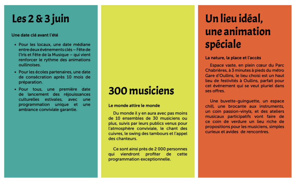 Dans cette optique, Music 85 a voulu ce Festival comme un événement emblématique et fédérateur réunissant toutes les générations d’Oullinois et des communes avoisinantes. Ainsi, une réunion d’ensembles régionaux, professionnels, semi-professionnels ou amateurs confirmés se relaieront dès le vendredi soir et jusqu’au samedi soir avec deux exigences : la qualité et la diversité des styles.