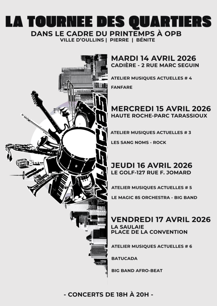et vendredi 16 mai, l’orchestre à l’école Ampère et le Brass band pour la tournée des quartiers à 18h30 puis de nouveau le Brass Band pour la guinguette des commerçants au centre commercial de l’Oasis.