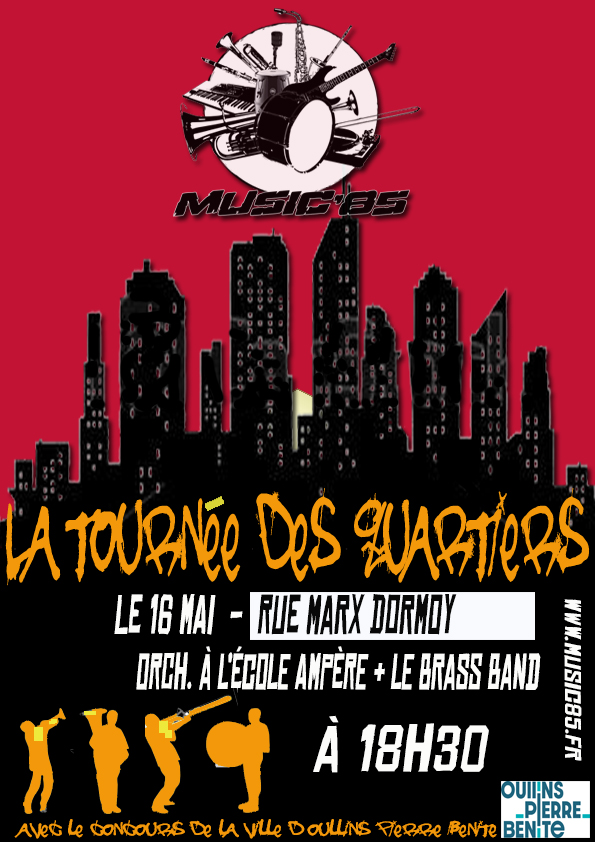 et vendredi 16 mai, l’orchestre à l’école Ampère et le Brass band pour la tournée des quartiers à 18h30 puis de nouveau le Brass Band pour la guinguette des commerçants au centre commercial de l’Oasis.