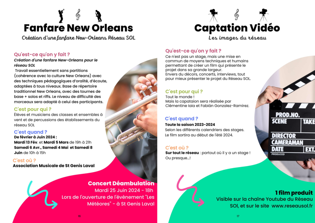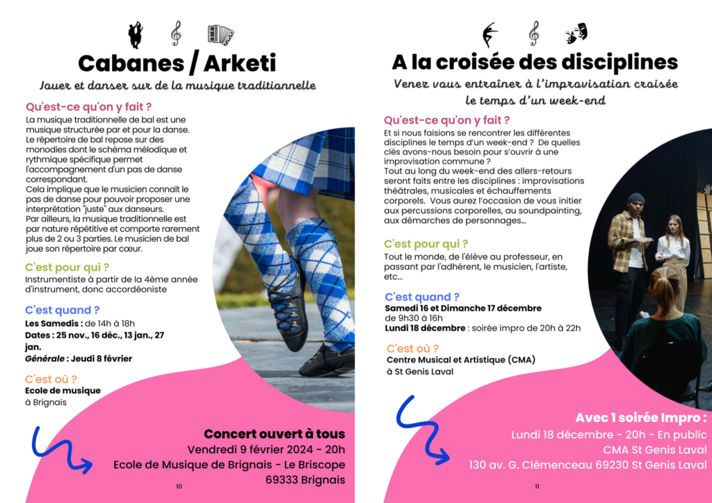 Chaque personne adhérent à ou étant élève de l’un des établissements du réseau peut accéder à des pratiques de découverte ou d’approfondissement, dans la limite des places disponible, bien évidemment. Certains stages débouchent sur des productions publiques (concerts / rendus).